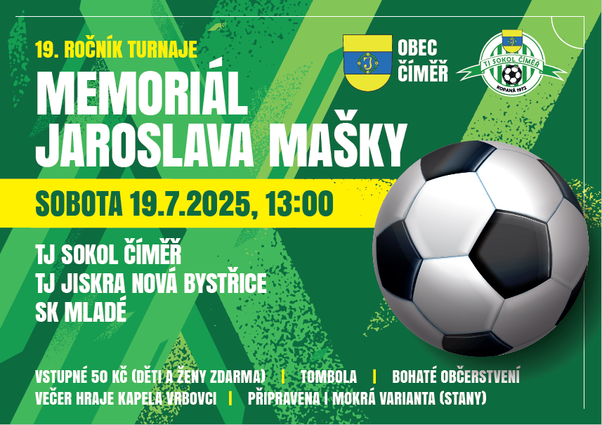 19. ročník fotbalového turnaje Memoriál Jaroslava Mašky se uskuteční v sobotu 19. července 2025 od 13:00 hod na hřišti v Číměři.