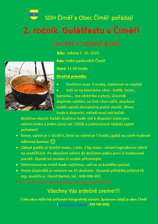 SDH Číměř a Obec Číměř pořádají 2. ročník Gulášfestu. Občerstvení na místě bude zajištěno, vaří se za každého počasí. Po vaření nám k dobré náladě zahraje skupina DIXIE.