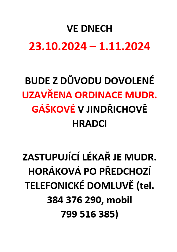 Ve dnech 23.10.- 1.11.2024 bude z důvodu dovolené uzavřena ordinace MUDr. Gáškové v Jindřichově Hradci. Zastupující lékař je MUDr. Horáková po předchozí domluvě.