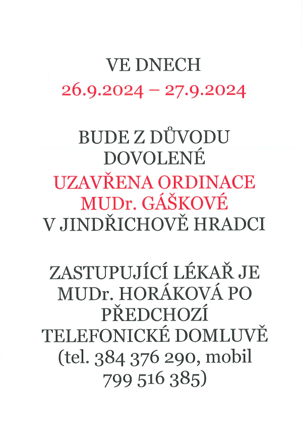 DOVOLENÁ MUDr. Gášková - 26. - 27. 9. 2024