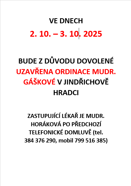 Ve čtvrtek 2.10 a v pátek 3.10.2025 bude uzavřena ordinace MUDr. Gáškové v J. Hradci. Zastupující lékař je MUDr. Horáková.