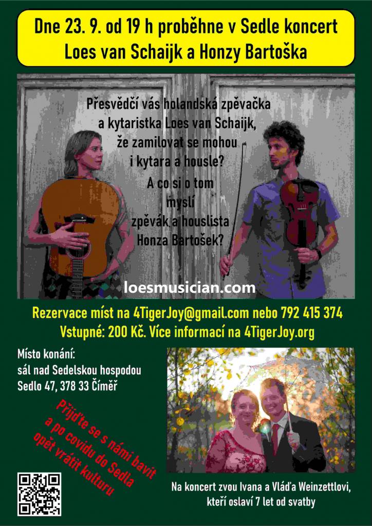 Dne 23. 9. 2023 od 19.00 hodin se na sále Sedelské hospody uskuteční koncert nizozemské kytaristky a zpěvačky Loes van Schaijk a houslisty Honzy Bartoška.