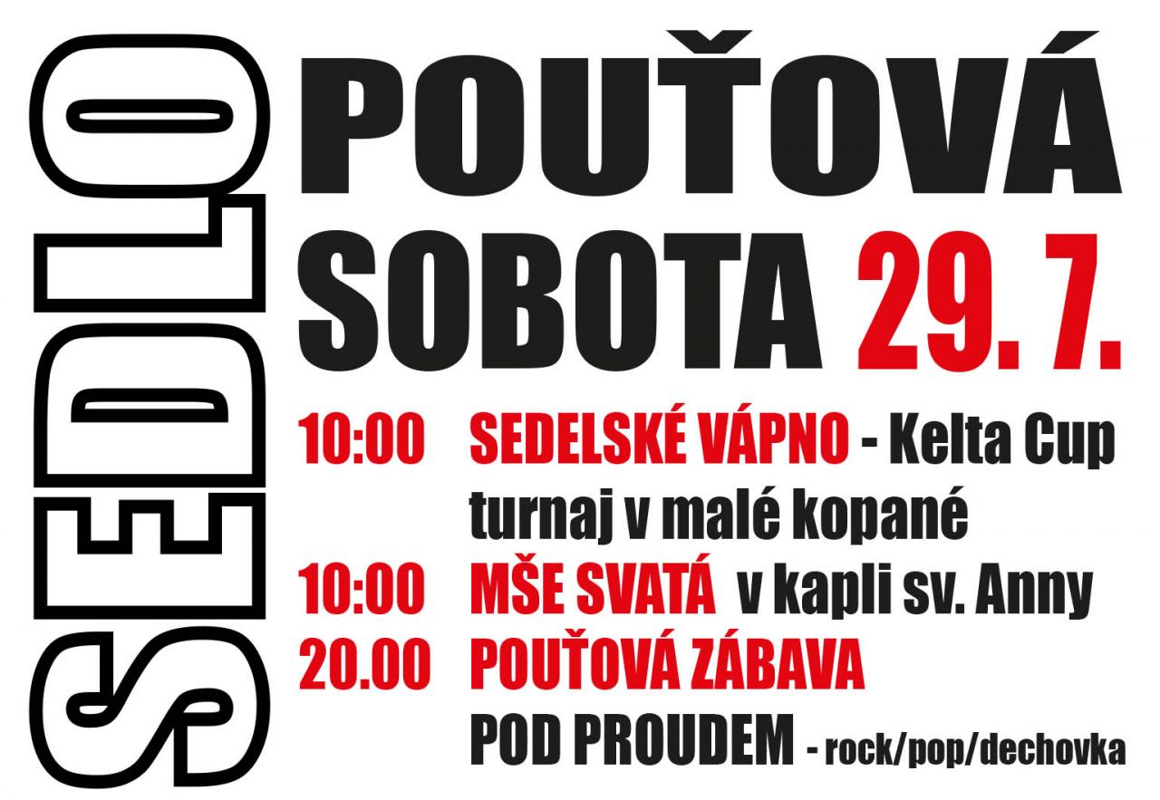 10:00 - Sedelské vápno - Kelta Cup (turnaj v malé kopané) 10:00 - Mše svatá v kapli sv. Anny 20:00 - Pouťová zábava - Pod proudem (rock/pop/dechovka)