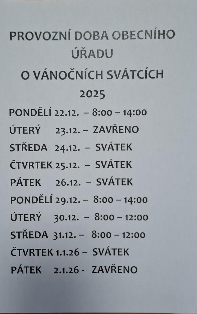 PROVOZNÍ DOBA OBECNÍHO ÚŘADU O VÁNOČNÍCH SVÁTCÍCH 2025.