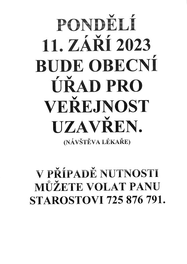 V pondělí 11. září 2023 bude obecní úřad pro veřejnost uzavřen. V případě nutnosti můžete volat panu starostovi - 725 876 791