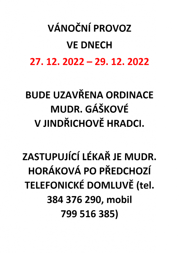 Vánoční provoz – ordinace MUDr. Gášková – JH