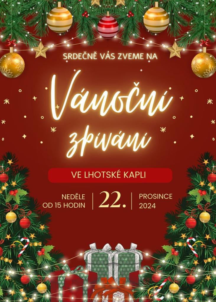 Přijďte si užít Vánoční zpívání ve lhotské kapli! Akce se koná 22. prosince 2024 od 15 hodin a je ideální pro všechny milovníky vánoční atmosféry. Nezapomeňte si přinést dobrou náladu!