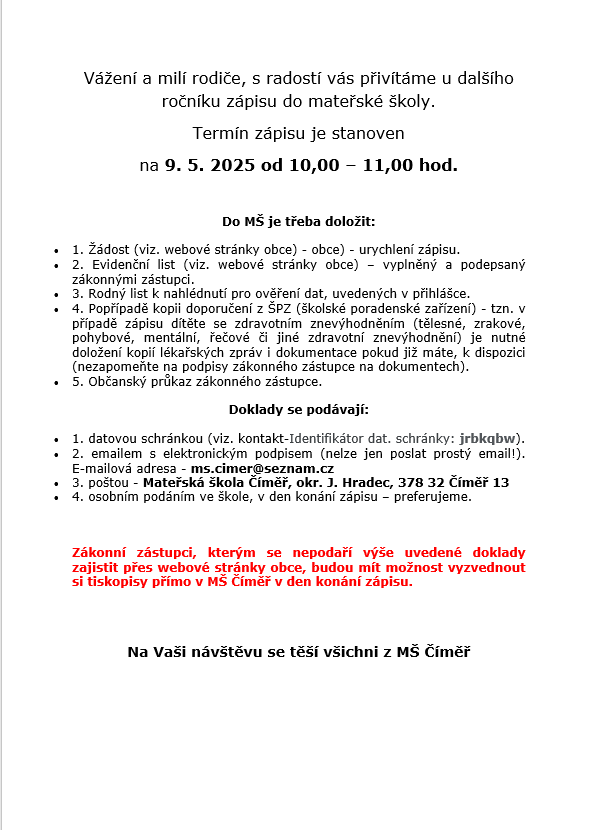 Termín zápisu do MŠ v Číměři je stanoven na 9. května 2025 od 10:00 - 11:00 hod. Všechny potřebné dokumenty k vyplnění naleznete na stránkách obce Číměř.
