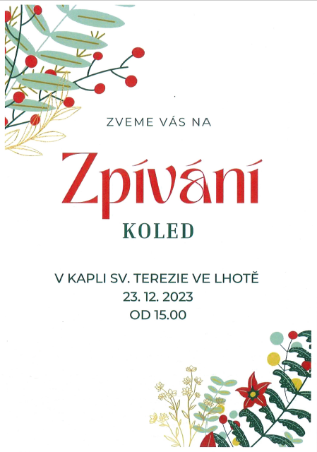 V sobotu 23. 12. 2023 od 15:00 hodin Vás srdečně zveme na zpívání koled v kapli sv. Terezie ve Lhotě